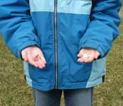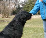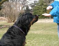 download a printer-friendly version of this page! Leave It! This is not a competition exercise - this is for when you are going for a walk, and realize that your dog is making a beeline for something truly disgusting. You tell him "Leave it!" and he does so. Also works for telling your dog to get away from something else such as a plate of food on the table, or for when you drop something on the ground you really don't want him to have. I even know a a dog that will respond to "Leave it" when his owner wants him to move away from another dog! This is an essential behavior for any dogs who will be doing therapy work. Okay - get yourself ready. Have a bunch of little treats - some really tasty ones & some so-so ones (I'll use hot dog slices & Cheerios as an example). Have a couple of Cheerios in one hand which will be the "Leave it" hand (to begin with, anyway) and a hot dog slice in your other hand (your "Get it" hand). Hold out your first hand, open to show the Cheerios. Your dog will, of course, start to reach for them. Say "Leave it!" and close your hand. However, keep the hand down at his level - don't yank it away, just close it into a soft fist. He will probably lick & nibble at your hand, trying to get the Cheerios. When he gives up & pulls his head back you need to immediately C&T, giving the much tastier hot dog from your other hand.
